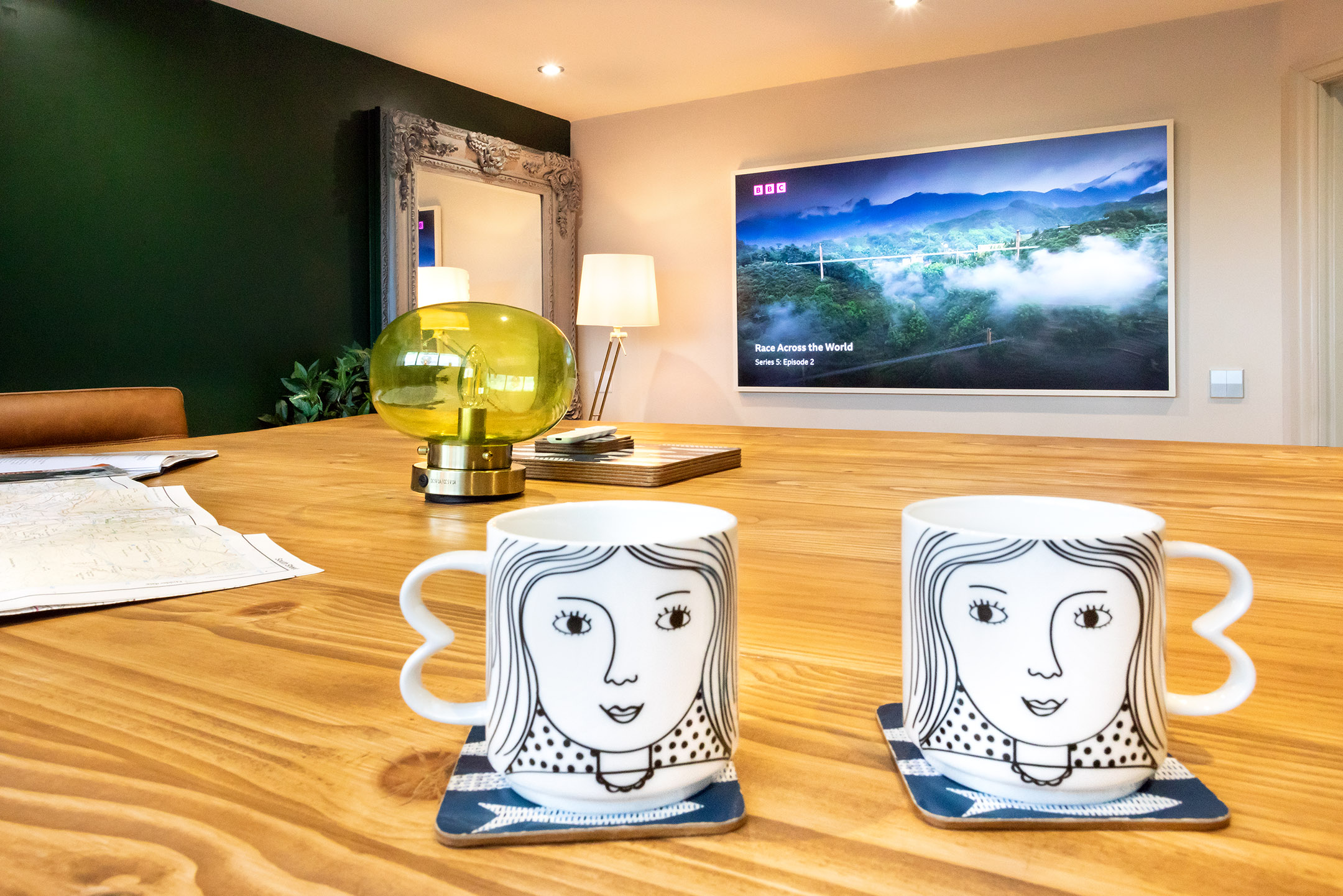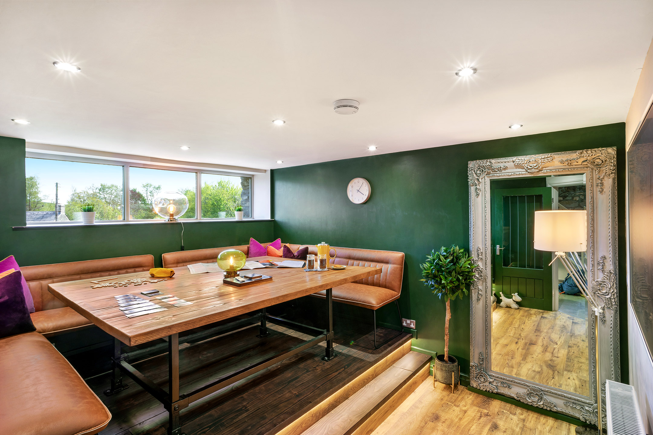 Ultra chic downstairs dining lounge with 65″ Smart TV